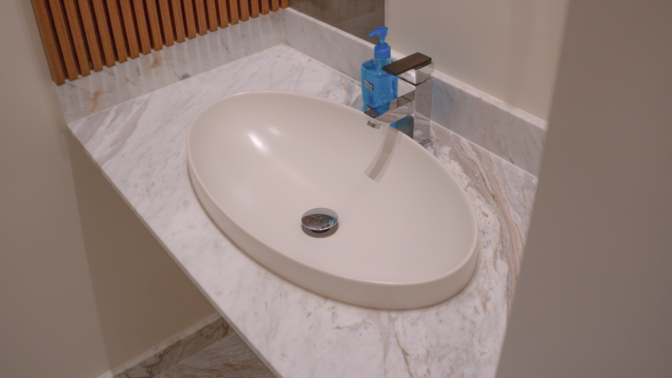 This modern villa in Bani Jamra is a striking example of contemporary design, with a focus on creating a cohesive and stunning aesthetic through the use of materials. The standout feature of the villa’s design is the book match effect created using Kastaveiny Greek marble, which has been seamlessly applied across the flooring, steps, and countertops. This choice of marble not only unifies the different areas of the villa but also enhances the space with its bold, symmetrical pattern that adds an edgy yet elegant touch. The wall cladding features Sahara Noir porcelain, which beautifully contrasts with the marble, adding depth and texture to the overall look. A thoughtfully chosen accent color highlights the decorative corner and mini waterfall, bringing edgy and vibrancy to the space. The combination of these elements results in a refined and balanced design that showcases both luxury and modernity in perfect harmony.