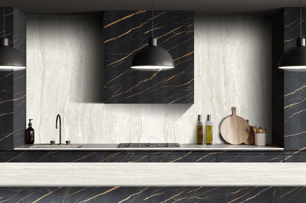 Portoro is a BIG porcelain slab with an elegant marble-effect design. Measuring 160×320 cm and 12 mm thick, it is ideal for flooring, wall cladding, kitchen countertops, and dining table surfaces. When used for flooring, its large format creates a seamless look, giving spaces a wider and more expansive feel.
